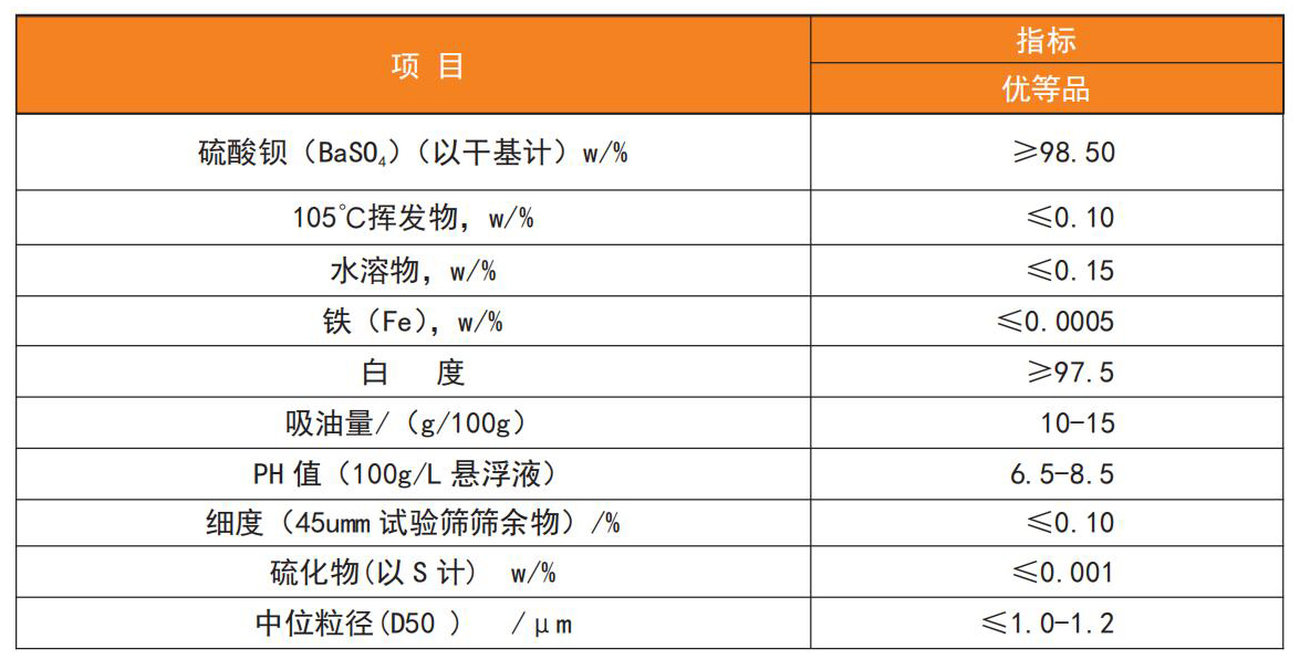 BaSO4為微白色斜方晶體、或無(wú)定形白色粉末,是唯一的無(wú)毒鋇鹽。硬度適中、高比重、高白度可作為一種中性體質(zhì)填料。15℃時(shí)相對(duì)密度為4.499,熔點(diǎn)為1580℃。在1150℃左右會(huì)發(fā)生多晶轉(zhuǎn)變,在約1400℃時(shí)出現(xiàn)顯著分解。25C°時(shí),BaSO4溶度積常數(shù)Ksp=1.1×10-10。